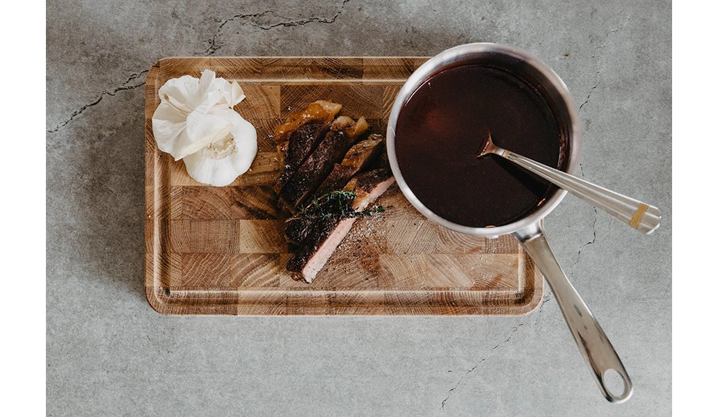 Tillverkad av stavlimmat ändträ från nordisk ek, med ränna för köttsaft och utkarvat handtag.