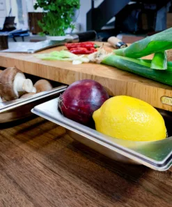 En snygg och praktisk skärbäda i gummiträ med uppsamlingsbleck i rostfritt stål. Gör ungnsformen med grönsakerna klar direkt vid skärbrädan eller sortera bort blast och skal så skärbrädan alltid är ren.
