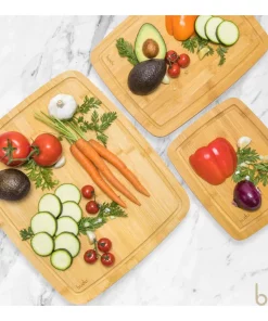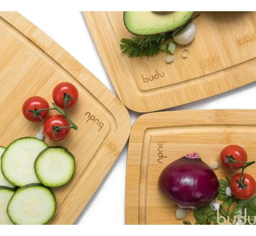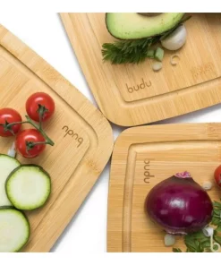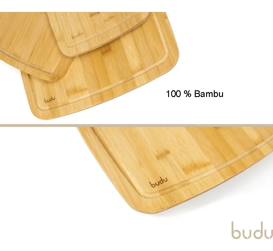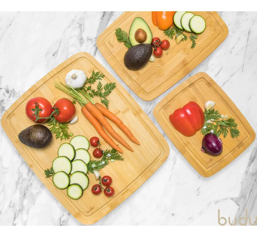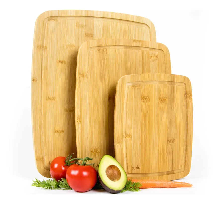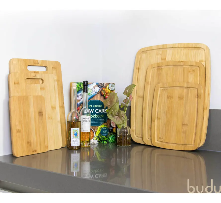 Skärbrädesetet från Budu består av 3 olika skärbrädor. På så sätt kan du skära dina ingredienser hygieniskt. Alla tre skärbrädorna är gjorda av bambu. Bambu är ett mycket starkt och slitstarkt material. Dessutom har den ett lyxigt utseende. Alla tre skärbrädorna har en juicekant på ena sidan, så att saften från dina grönsaker eller kött inte når din bänkskiva.